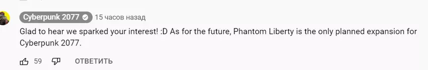 Później, w komentarzach do zwiastuna DLC na kanale Cyberpunk YouTube, jeden z użytkowników zapytał, czy oprócz zapowiedzianego, pojawi się więcej poważnych dodatków do Cyberpunka. Przedstawiciel studia odpowiedział, że Phantom Liberty jest jedynym planowanym rozszerzeniem.