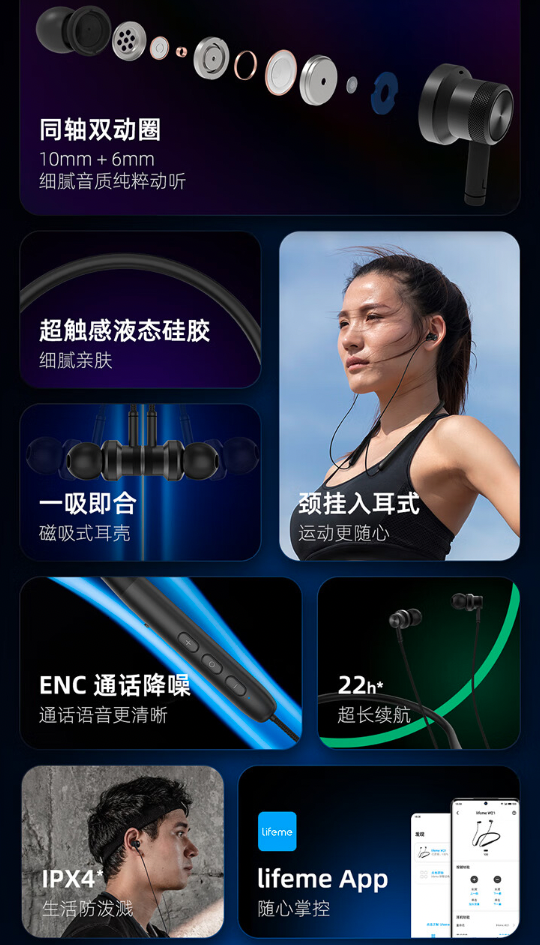Producent pozycjonuje nowy produkt jako model sportowy. Słuchawki otrzymują 10mm + 6mm koaksjalną ruchomą cewkę, która pozwala urządzeniu wydobyć głębszy i niższy dźwięk, a także ochronę IPX4 przed kroplami wody i potem oraz funkcję ENC. Tłumi obce dźwięki podczas rozmów. Opaska Meizu Lifeme W21 Neckband posiada trzy przyciski sterujące i jest dostosowywana za pomocą autorskiej aplikacji. Jeśli chodzi o czas pracy na baterii, to wytrzyma on do 22 godzin słuchania muzyki.