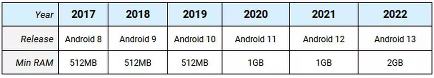 Tak więc, począwszy od Androida 13, smartfon będzie potrzebował co najmniej 2GB pamięci RAM i 16GB pamięci wewnętrznej, aby uruchomić aplikacje GMS Google. Dotyczy to nawet urządzeń z systemem Android Go, które zazwyczaj celują w budżetowe telefony z małą ilością pamięci RAM.