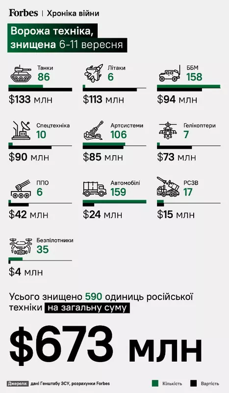 Między 6 a 11 października ukraińscy obrońcy zniszczyli 590 sztuk wrogiego sprzętu o łącznej wartości 673 000 000 dolarów. W tym 86 czołgów, 6 samolotów, 158 pojazdów opancerzonych, 10 pojazdów specjalistycznych, 106 systemów artyleryjskich, 7 śmigłowców, 6 systemów obrony powietrznej, 159 pojazdów, 17 MLRS i 35 dronów. Większość sprzętu została zniszczona w obwodzie charkowskim.