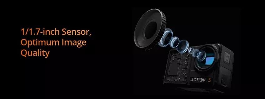 DJI Osmo Action 3 posiada sensor optyczny 1/1.7" o rozdzielczości 12 MP. Aparat wyposażono w obiektyw o kącie widzenia 155 stopni i przysłonie f/2.8. Gadżet może nagrywać wideo w rozdzielczości 4K ULTRA HD z prędkością klatek do 120 FPS i wspiera technologie stabilizacji RockSteady 3.0 i HorizonSteady.