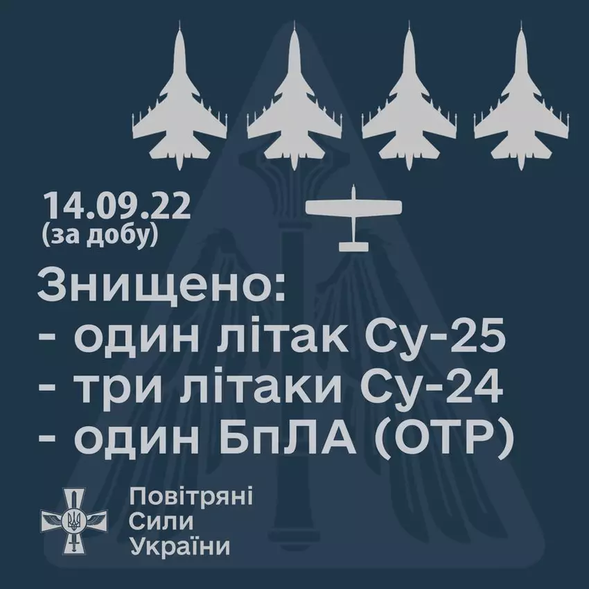 Rosyjskie lotnictwo tylko w ciągu jednego dnia straciło trzy bombowce frontowe Su-24. Zniszczony został również jeden samolot szturmowy Su-25 Grach. Sztab Generalny Sił Zbrojnych Ukrainy informuje, że od 15 września zestrzelono już 250 samolotów wroga.
