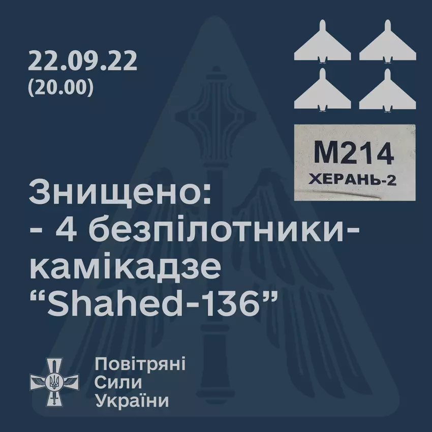 "22 września około godziny 20:00 w rejonie Mikołajewa żołnierze przeciwlotniczej brygady rakietowej Odeskiego Dowództwa Lotniczego Południe zestrzelili dwoma pociskami kierowanymi średniego zasięgu jednocześnie cztery rosyjskie drony kamikadze Shahed-136 produkcji irańskiej" - czytamy w raporcie.
