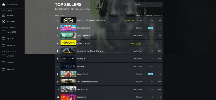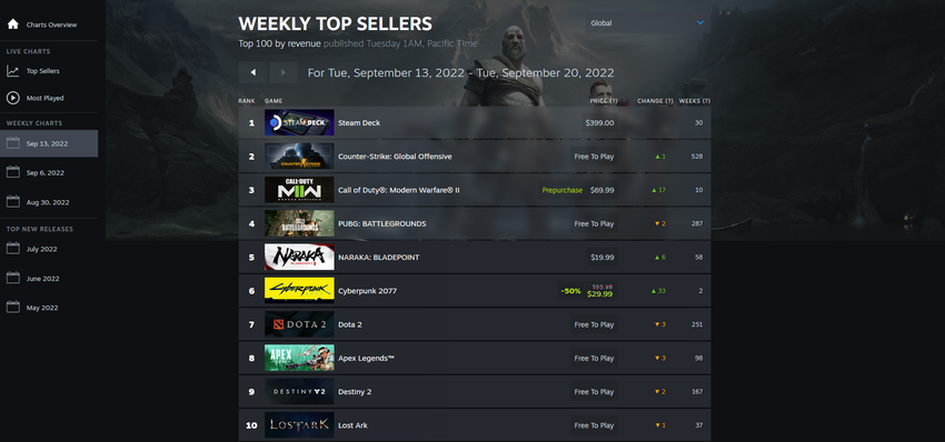 Teraz możesz zobaczyć najlepiej sprzedające się gry w czasie rzeczywistym. Na listach znajdziemy również informację o tym, ile tygodni gra była na liście, informację o tym, o ile pozycji gra wzrosła lub spadła, cenę oraz możliwość zobaczenia rankingu na świecie i w poszczególnych krajach.