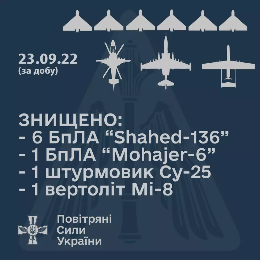 Dowództwo Sił Powietrznych informuje, że ukraińskie służby zniszczyły dziewięć celów powietrznych w ciągu ostatnich 24 godzin, 23 września. Wśród nich jest 6 dronów kamikadze Shahed-136, które są produkowane w Iranie i wykorzystywane przez Rosję, jeden strike UAV Mohajer-6 (również pochodzenia irańskiego), samolot szturmowy Su-25 i śmigłowiec Mi-8.