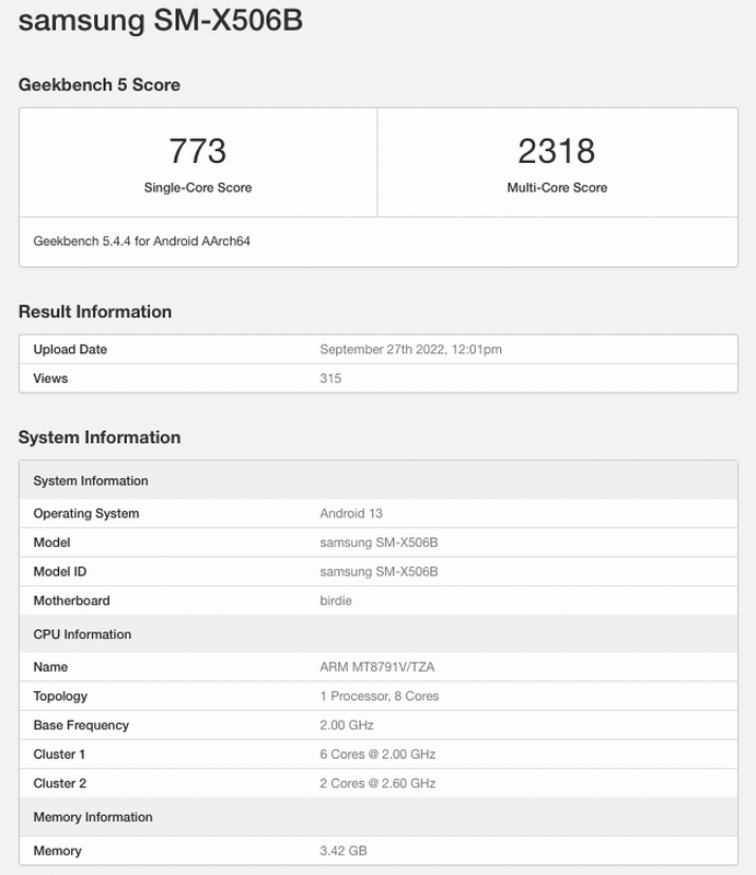 Urządzenie zostało dostrzeżone w bazie testów wydajności Geekbench. Tablet przechodzi z numerem modelu SM-X506B. Według kilku źródeł jednocześnie, jest to Galaxy Tab S8 FE.
