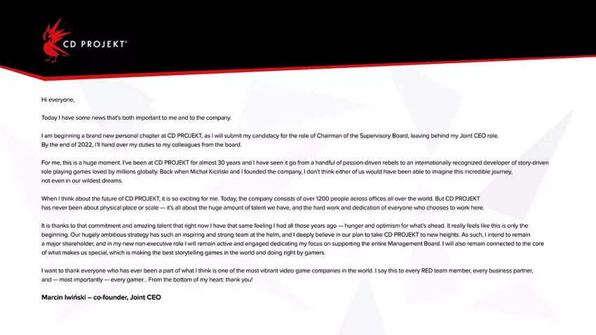Do końca roku Marcin Iwiński przekaże wszystkie obowiązki innemu menedżerowi, ale pozostanie głównym udziałowcem i jak powiedział, zawsze będzie wspierał swoją macierzystą firmę radą i pomysłami.