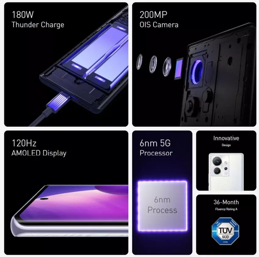 ZERO ULTRA działa na procesorze MediaTek Dimensity 920. Układ zbudowany jest w technologii 6nm. Posiada on dwa rdzenie Cortex-A78 2,5 GHz, sześć rdzeni Cortex-A55 2,0 GHz oraz procesor graficzny Mali-G68 MC4. Smartfon wyposażony jest w 8 GB pamięci RAM i 256 GB pamięci masowej. Nowość zasilana jest przez baterię o pojemności 4500 mAh. Obsługuje szybkie ładowanie o mocy 180W. Od 0 do 100% gadżet ładuje się w 12 minut. Może się też pochwalić 200 MP aparatem głównym. Uzupełnia go szerokokątny obiektyw 13 MP i czujnik głębi 2 MP. Przedni aparat w nowości jest 32-megapikselowy.