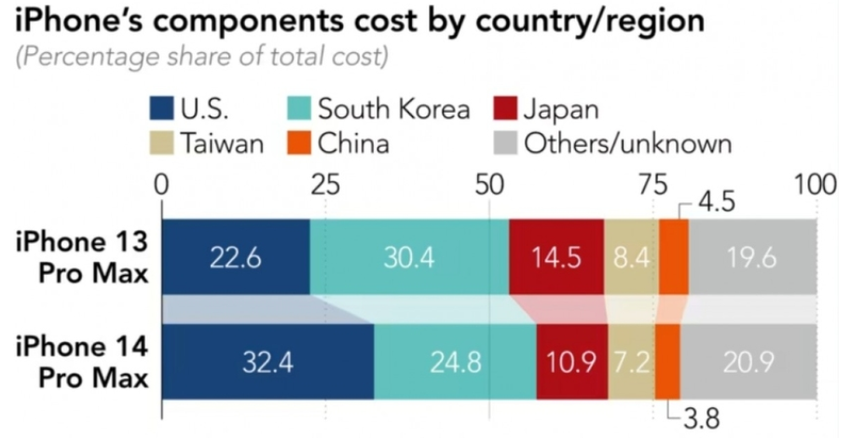 Prawie jedna trzecia (32,4%) komponentów pochodzi od firm z USA, podczas gdy w iPhone 13 Pro Max ich udział wynosił niespełna jedną czwartą (22,6%). W pierwszej trójce znajdują się komponenty południowokoreańskie (24,8%) i japońskie (10,9%). Choć w porównaniu z iPhone 13 Pro Max ich udziały spadły odpowiednio o 5,6% i 3,6%.