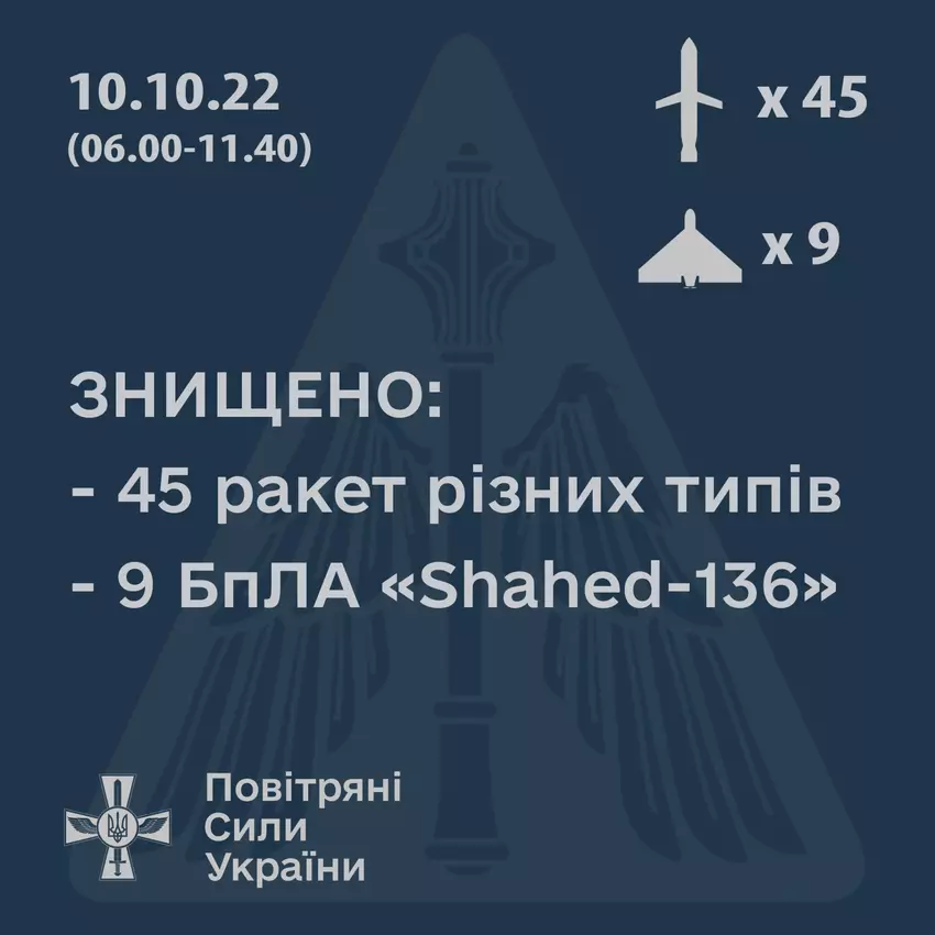 Według dowództwa sił powietrznych do godziny 10:40 (CET) Rosja wystrzeliła ponad osiemdziesiąt pocisków różnego kalibru, w tym rakiety Iskander z Morza Czarnego, X-101 (X-555) bombowców strategicznych T-95 i T-160. Ponadto przeciwnik używał systemów rakietowych wielokrotnego odpalania Tornado-S, systemów rakietowych ziemia-powietrze S-300 oraz dronów kamikaze Shahed-136.