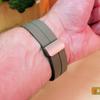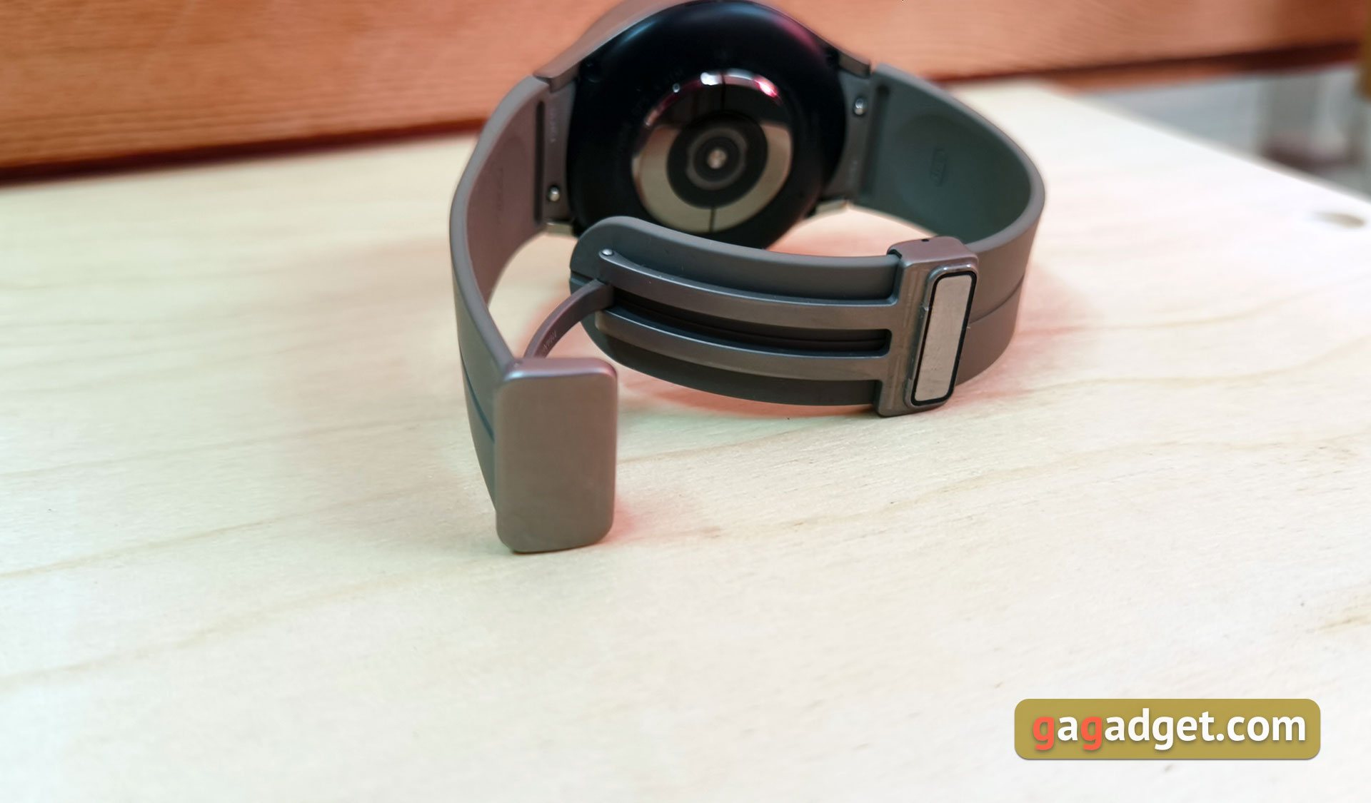 Samsung Galaxy Watch5 Pro posiada w zestawie silikonowy pasek w odpowiednim kolorze. Jest przyjemna w dotyku, wygodna i dość elastyczna. Wersja Pro posiada również nietypowe magnetyczne zapięcie, które również wykonane jest z tytanu o tym samym kolorze co sam smartwatch. Zapięcie to ma zarówno pozytywne, jak i negatywne strony. Jest to bardzo wygodne podczas bezpośredniego korzystania z Samsunga Galaxy Watch5 Pro. Konstrukcja nie przewiduje jednak całkowitego oddzielenia części paska, co nie jest zbyt wygodne podczas ładowania z bezprzewodowych ładowarek innych firm lub ze smartfona.