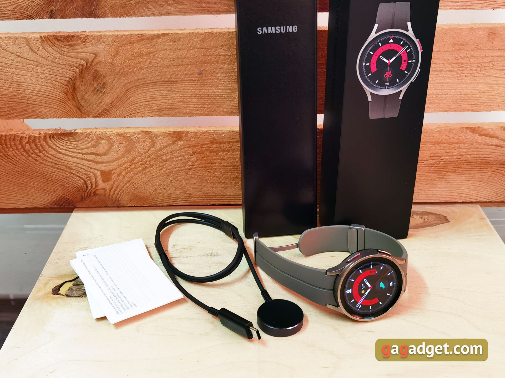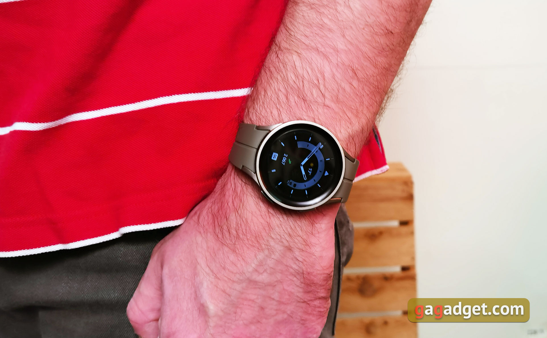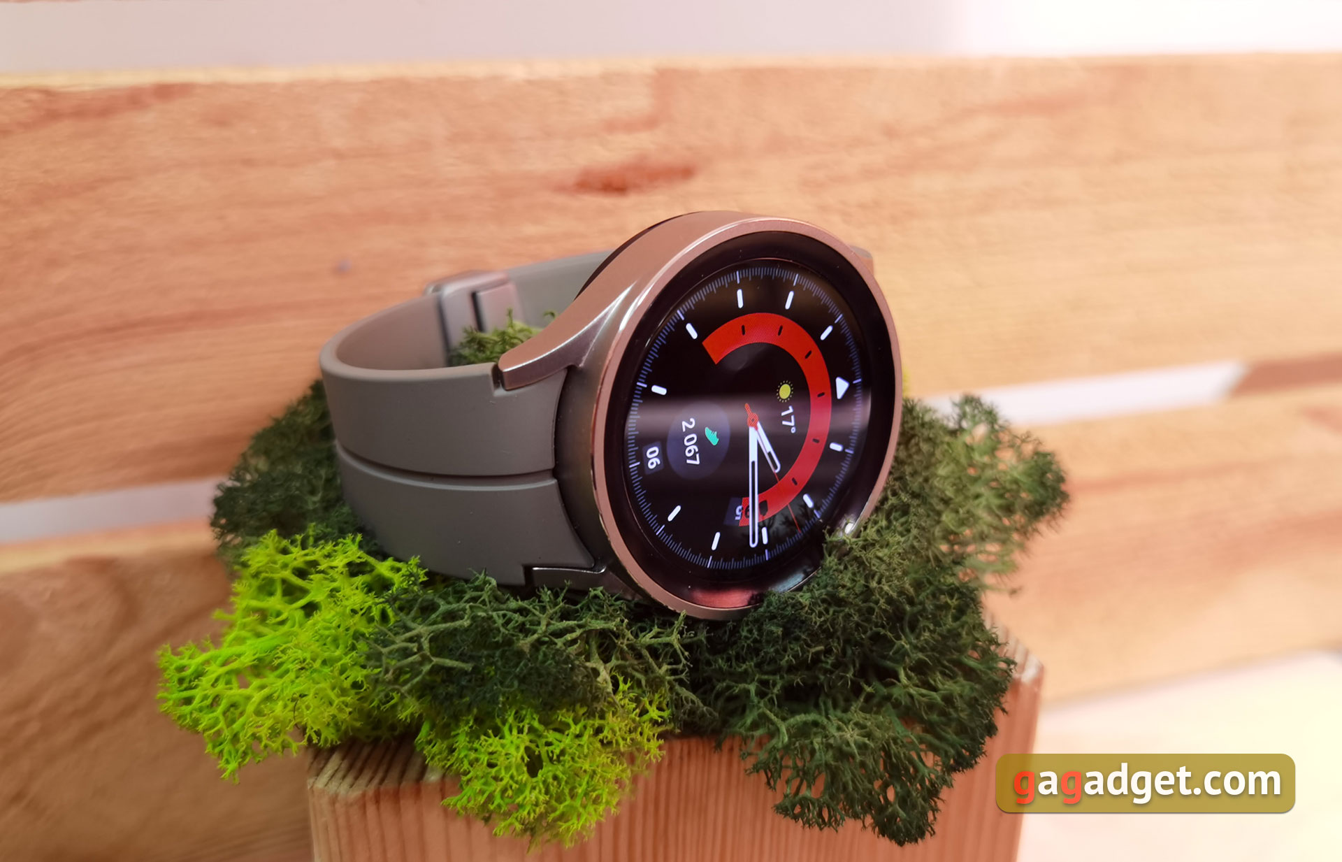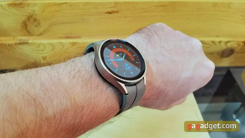 Samsung Galaxy Watch5 Pro okazał się dość masywny i znacząco różni się od poprzedniego modelu Classic. Wyglądają one bardziej minimalistycznie i sportowo, natomiast Classic ze względu na bezel bardziej przypominał klasyczny zegarek. Galaxy Watch5 Pro ma wysoką krawędź wokół ekranu, która zapewnia dodatkową ochronę przed wstrząsami, a także plastikową, czarną ramkę wewnątrz. Ma wklęsły kształt, co jest wygodne przy korzystaniu z wirtualnej ramki dotykowej. Watch5 Pro jest zauważalnie grubszy od poprzednich modeli, co generalnie jest uzasadnione zwiększoną baterią.