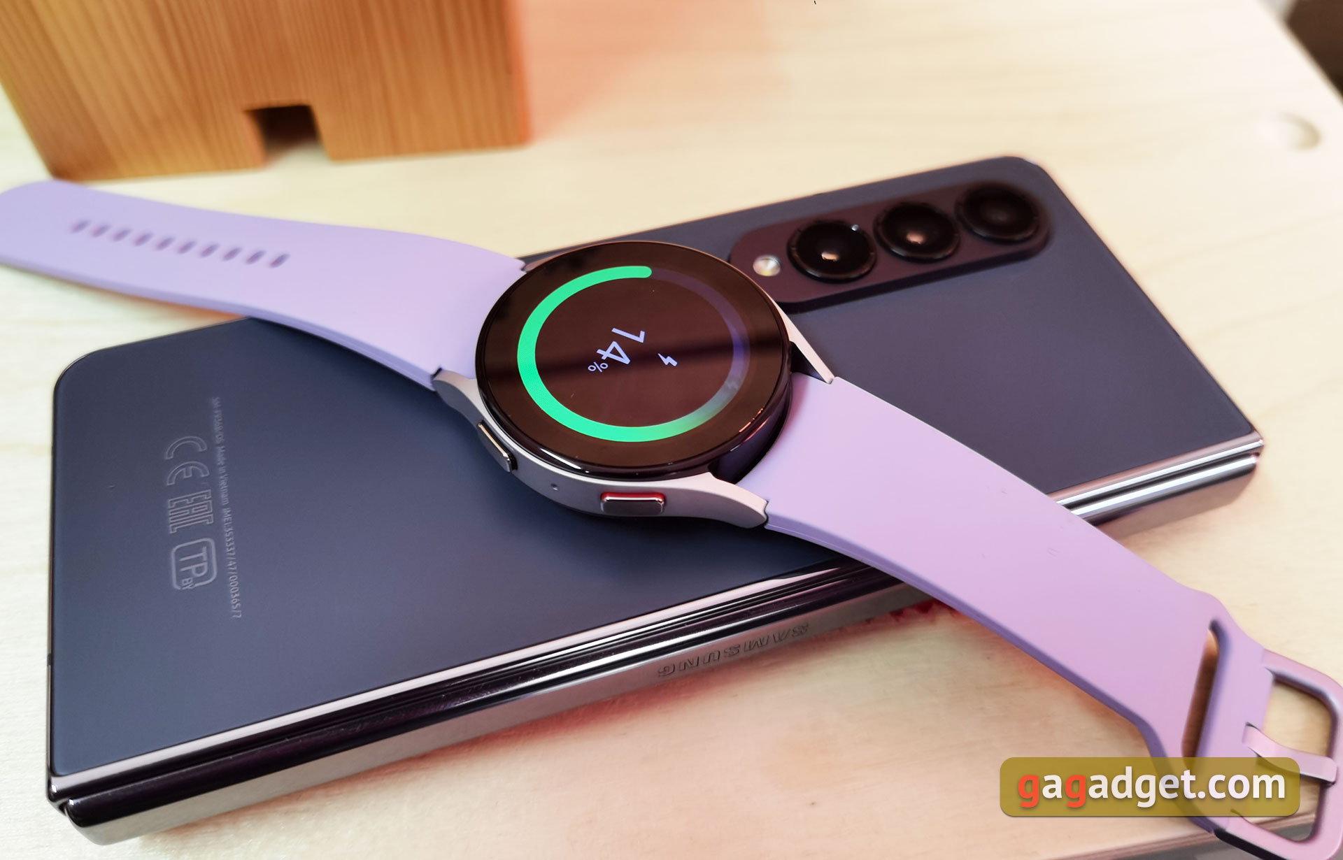 Istotną zaletą nowego Samsunga Galaxy Watch5 Pro i Watch5 jest zwiększona bateria. Przypomnijmy, że w wersji Pro jest to 590 mAh, w Watch5 40 mm - 284 mAh (w przeszłości było to 247 mAh). Wzrost czasu pracy na baterii jest naprawdę bardzo znaczący, zwłaszcza w przypadku Samsunga Galaxy Watch5 Pro. Zegarek był wykorzystywany "na maksa": automatyczne rejestrowanie spacerów, treningów, stałe monitorowanie poziomu tlenu we krwi podczas snu, śledzenie chrapania, stały pomiar tętna i stresu, Always on Display, wiele powiadomień, sterowanie odtwarzaczem, jeden lub dwa joggingi przez pół godziny. W tym trybie zegarek wytrzymuje 2,5-3 dni. Poprzednia generacja w podobnym trybie wytrzymywała 1-1,5 dnia, więc różnica jest bardzo znacząca. Zwykły Samsung Galaxy Watch5 ma nieco mniejszy wzrost, ale też jest: 1.5-2 dni. Tak, oczywiście, są bransoletki fitness, które można ładować raz w tygodniu. Ale porównywanie funkcjonalności jest absolutnie błędne.