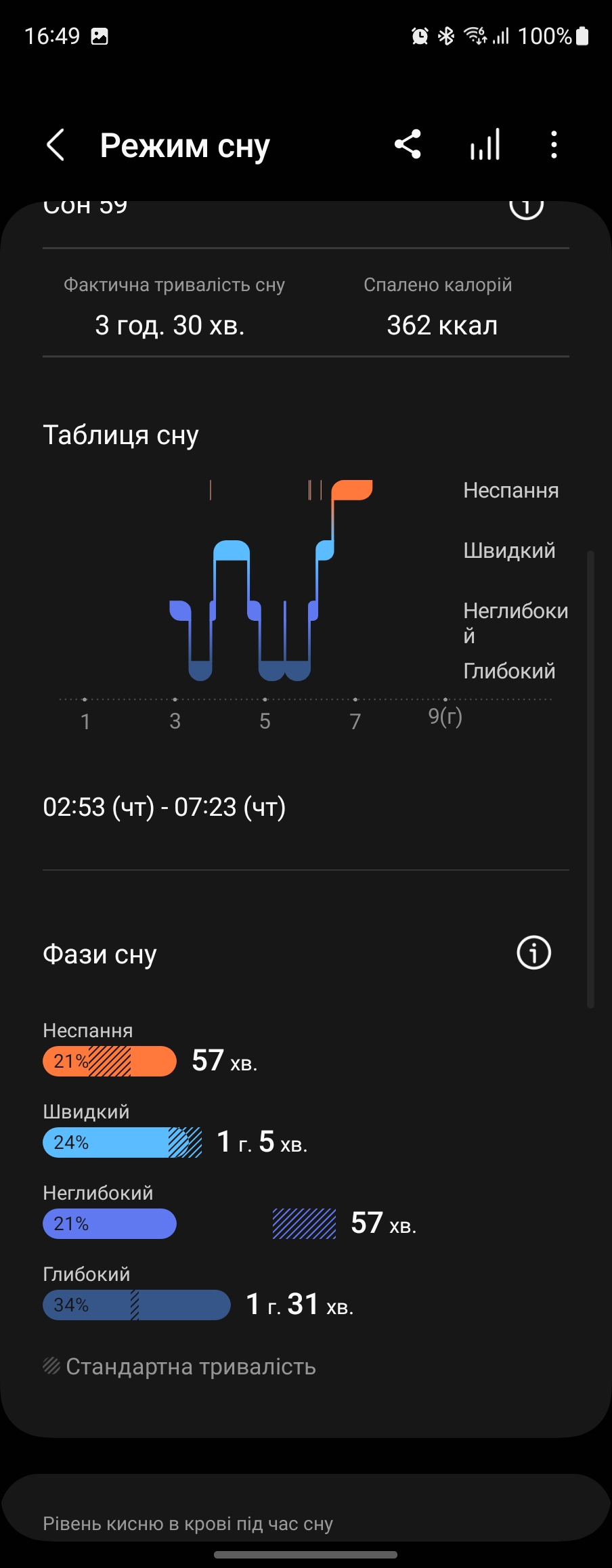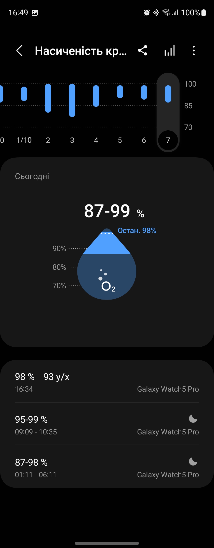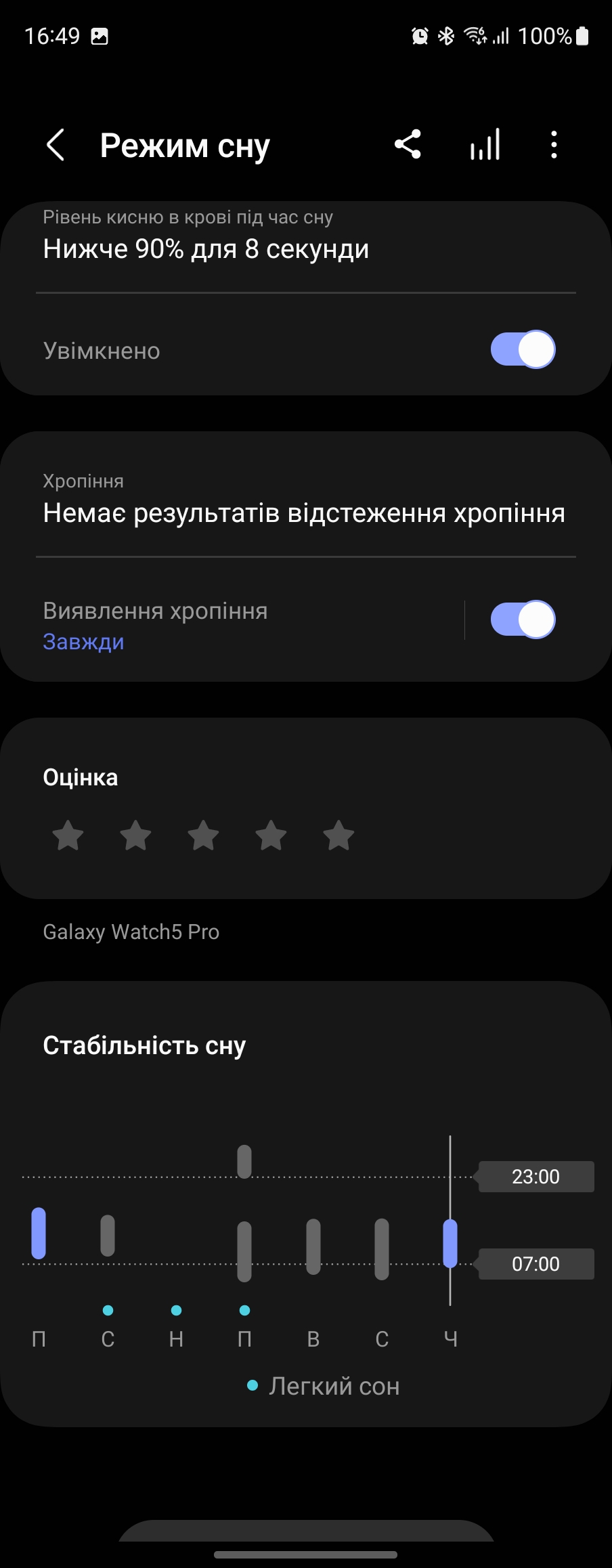 Samsung Galaxy Watch5 Pro i Watch5 mają wiele aplikacji treningowych, w tym chodzenie, bieganie, pływanie, trening siłowy, a nawet żeglowanie lub snowboard z instrukcjami i podpowiedziami głosowymi. Istnieje automatyczne rozpoznawanie niektórych ćwiczeń. Jednocześnie smartwatch mierzy liczbę kroków, spalone kalorie, tętno, poziom tlenu we krwi i może rejestrować trasę dzięki GPS. Jest też śledzenie czasu i jakości snu, a chrapanie można osobno włączyć za pomocą mikrofonu. Na podstawie statystyk za określony czas, w aplikacji można uzyskać wskazówki dotyczące poprawy snu. Dokładność większości pomiarów jest dość wysoka. Przede wszystkim chodzi o kroki, dystans (także na bieżni, gdzie dokładność nie zależy od GPS). Błąd pomiaru tętna nie przekracza 3%. Nieco trudniejsza jest sytuacja z poziomem tlenu we krwi. Normalny poziom to powyżej 95%. I zazwyczaj przy ręcznym pomiarze uzyskuje się takie wskaźniki. Ale przy automatycznym pomiarze podczas snu zakres ten może wynosić od 84% do 98%. Jednocześnie 92% jest już wskaźnikiem do hospitalizacji. Jest to dość proste do wyjaśnienia: przy normalnym pomiarze zegarek powinien być mocno dociśnięty do ręki. Niemożliwe jest kontrolowanie prawidłowej pozycji podczas snu.