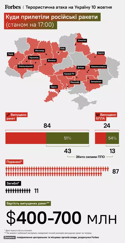 Według obliczeń sił powietrznych AFU, Forbesa i analityków wojskowych, a także niektórych międzynarodowych umów o sprzedaży broni, wiemy, że jeden pocisk X-101 kosztuje około 13 milionów dolarów, X-555 - 7,5 miliona dolarów, Kalibr - 6,5 miliona dolarów, inne wymienione pociski - od 3 do 0,5 miliona dolarów. Tak więc, jak wyliczyli ochotnicy, atak w ciągu zaledwie jednego dnia 10 października kosztował Rosję ponad 3,5 do 4 miliardów dolarów.