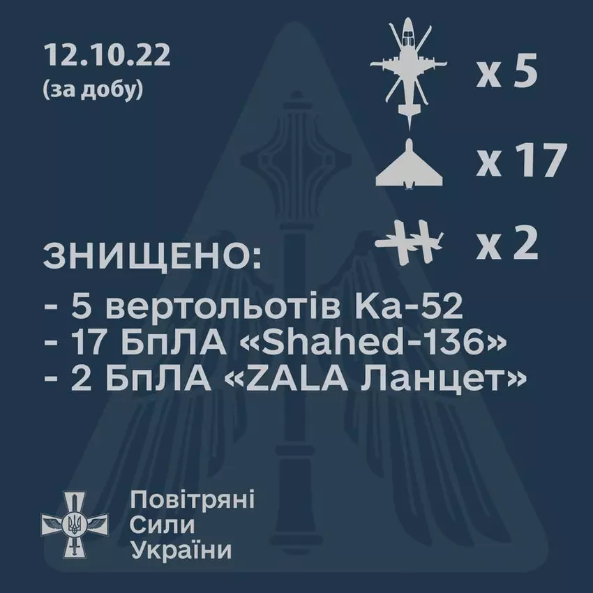 12 października siłom powietrznym Sił Zbrojnych Ukrainy udało się wyeliminować blisko dwa tuziny rosyjskich dronów i pięć śmigłowców.