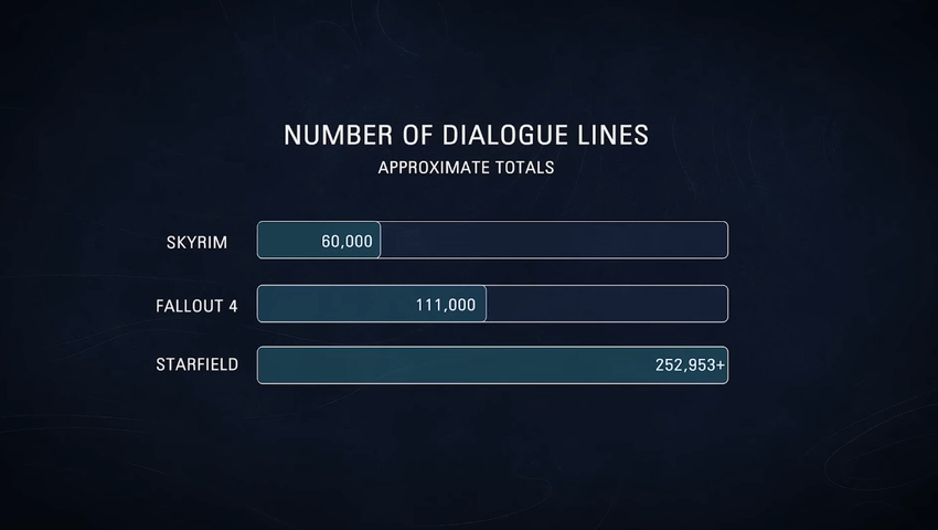 Mówili też o dialogach. Będą one przypominać klasyczne gry Bethesdy. Howard dodał, że Starfield będzie miał ponad 250 tysięcy linii dialogowych. Na przykład Fallout 4 miał 110 tysięcy linii.