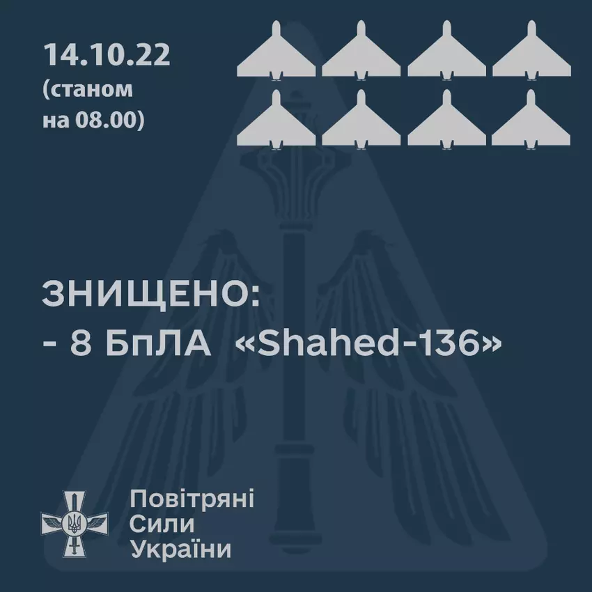 Do godziny 8:00 Siły Obrony Powietrznej Ukrainy zestrzeliły na południu i wschodzie osiem irańskich dronów kamikadze Shahed-136. Pięć z nich zostało zniszczonych przez siły rakiet przeciwlotniczych Sił Powietrznych, a trzy przez siły obrony przeciwlotniczej Marynarki Wojennej Ukrainy.