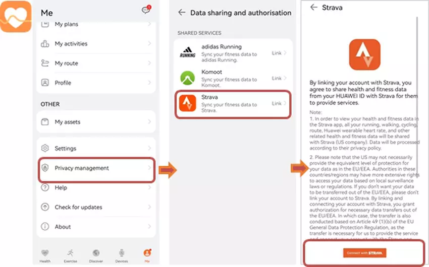 Aby zsynchronizować swoje dane, otwórz aplikację Huawei Health i w zakładce Me znajdź Privacy Management. Następnie należy wybrać Strava i autoryzować.