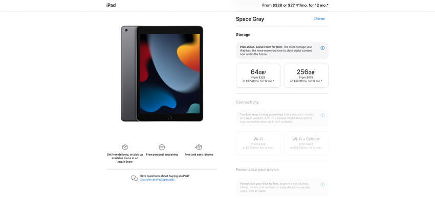 iPad 9. generacji jest nadal dostępny na oficjalnej stronie firmy, a cena urządzenia nie spadła. Tablet sprzedawany jest w dwóch modyfikacjach pamięci: bazowa wersja 64 GB kosztuje 329 dolarów, natomiast topowa 256 GB - 478 dolarów.