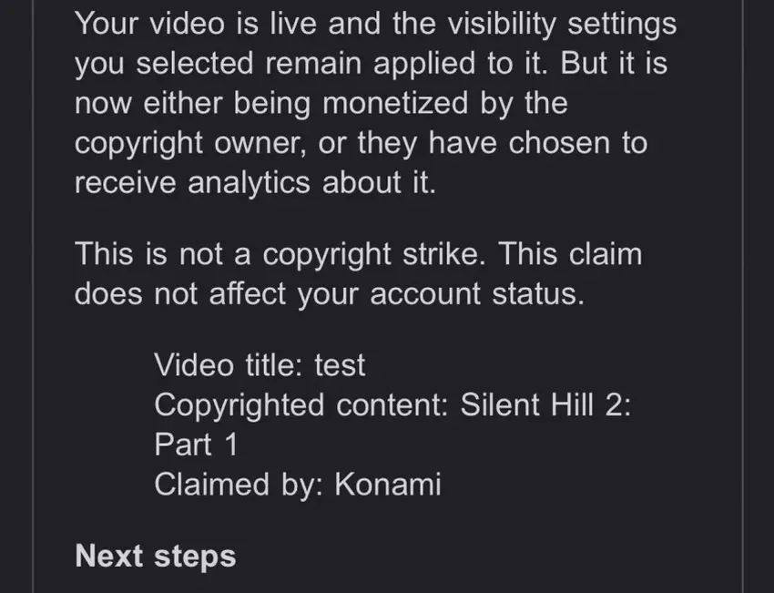 Twórca kanału YouTube SHN Survival Horror Network uruchomił testowy stream nadchodzącej prezentacji Konami, ale otrzymał blokadę transmisji. W wiadomości czytamy, że naruszył on prawa autorskie poprzez streaming pewnej gry Silent Hill 2: Part 1.