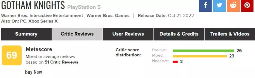 Sądząc po opiniach ekspertów, gra okazała się przeciętna: nie wywołała ani entuzjazmu, ani odrzucenia. Recenzje na agregatorach są tego wymownym świadectwem. Dla przykładu, wersja na PS5 dostała najwyższą ocenę na Metacritic, a dostała tylko 69 punktów! Natomiast wersje Gotham Knights z serii PC i Xbox otrzymałyodpowiednio 67 i 68 punktów.