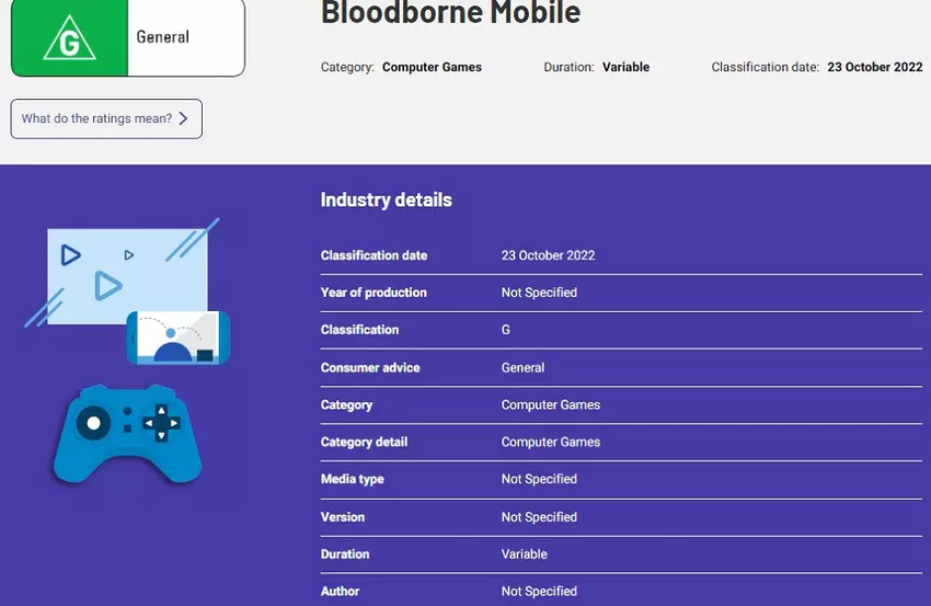 Dowodem na to jest niemal całkowity brak informacji na stronie komisji: brak platform, brak języka, brak wymienionego dewelopera, ale, co najsłodsze, gra ma rating G (0+) - coś, czego żaden projekt inspirowany Bloodborne nigdy nie mógłby mieć.