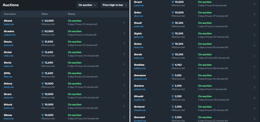 Możesz licytować tylko w walucie Toncoin. Twoja nazwa użytkownika musi mieć co najmniej cztery znaki. Na platformie Fragment jest już kilka krótkich nazw. Na przykład @elon, @audi, @fifa, @dior, których ceny wahają się od 19 000-25 000 dolarów. Najdroższą działką jest @bank. Minimalna oferta za niego wynosi obecnie ponad 100 tys. dolarów.