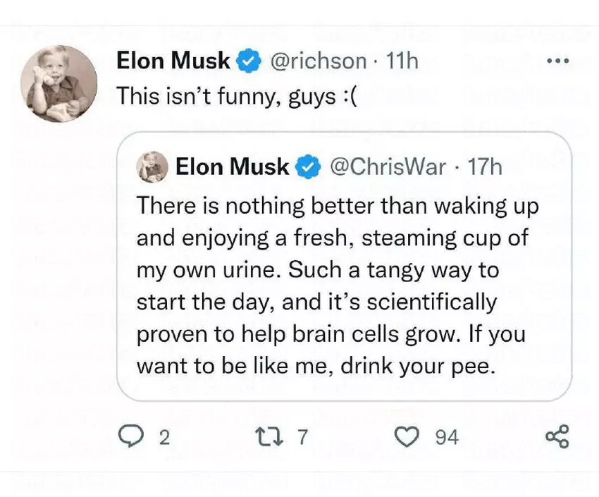 A inny użytkownik podszył się w ten sposób pod samego Muska, publikując post, który brzmiał: "Nie ma to jak obudzić się i wypić kubek swojego świeżego i pachnącego moczu. Taki orzeźwiający sposób na rozpoczęcie dnia. I jest naukowo udowodnione, że pomaga w rozwoju komórek mózgowych. Jeśli chcesz być taki jak ja, pij swój własny mocz". Jego konto zostało tymczasowo zablokowane, ale tweet zdążył rozejść się wirusowo.