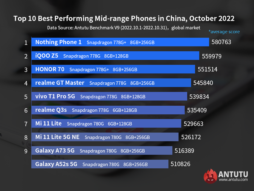 Na czele pierwszej dziesiątki modeli ze średniej półki znajduje się napędzany Snapdragonem 778G+ telefon Noting Phone (1). Udało mu się nieznacznie wyprzedzić iQOO Z5 oraz Honor 70. W pierwszej piątce znalazły się Realme GT Master i vivo T1 Pro 5G.
