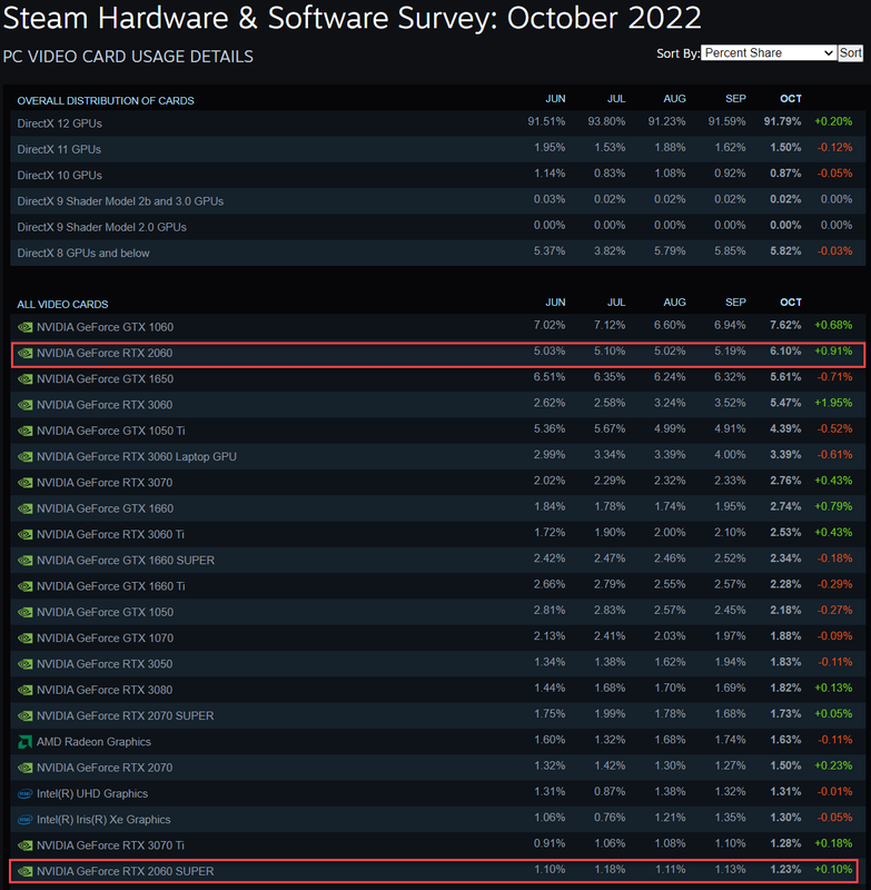 Warto zaznaczyć, że GeForce RTX 2060 od razu stał się bardzo popularną kartą graficzną wśród graczy. Według statystyk Steam, jedynie GeForce RTX 1060 jest częściej spotykanym akceleratorem. Tego samego nie można powiedzieć o RTX 2060 SUPER, choć ta karta graficzna dzięki stosunkowo niskiej cenie (399$) również znalazła swojego nabywcę, zyskując 1,23% udziału w Steamie