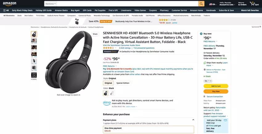 $96 zamiast $200: Sennheiser HD450BT bezprzewodowe słuchawki ANC na sprzedaż z wielką zniżką na Amazon