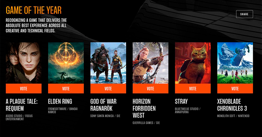 Gracze wybiorą zwycięzcę. Aby to zrobić, należy zalogować się na stronie The Game Awards i zagłosować na grę, którą uważacie za najlepszą w 2022 roku. Można to zrobić pod tym linkiem.