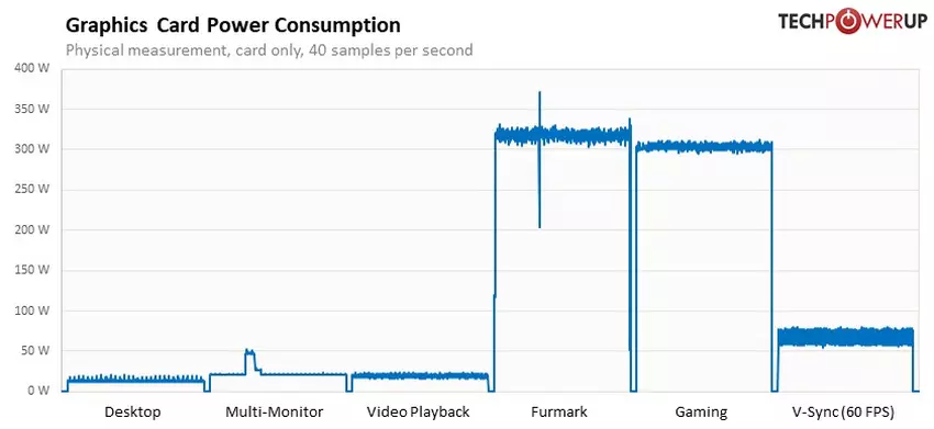 W grach i testach GeForce RTX 4080 zużywa średnio 300W. Maksymalny pobór mocy wyniósł 371W. Osobno odnotowujemy, że karta zaczęła pobierać 332,1W podczas podkręcania GPU, kiedy to częstotliwość ustabilizowała się na poziomie 2621,5 MHz przy deklarowanej maksymalnej wartości 2508 MHz.