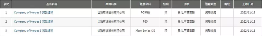 Taki wniosek można wysnuć z faktu, że tajwańska agencja ratingowa nadała rating wiekowy wspomnianym wersjom Company of Heroes 3.