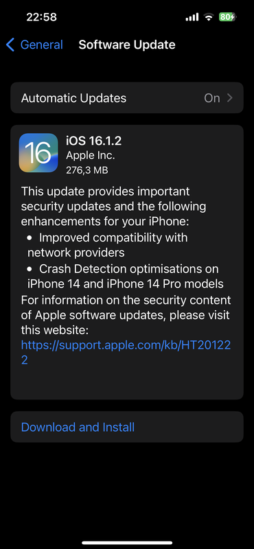 Firmware został wydany z nazwą iOS 16.1.2. Według listy zmian Apple, aktualizacja poprawia kompatybilność z operatorami sieci bezprzewodowych, a także optymalizuje funkcję Crash Detection w modelach iPhone 14 i iPhone 14 Pro. Twórcy poprawili też drobne błędy w systemie.