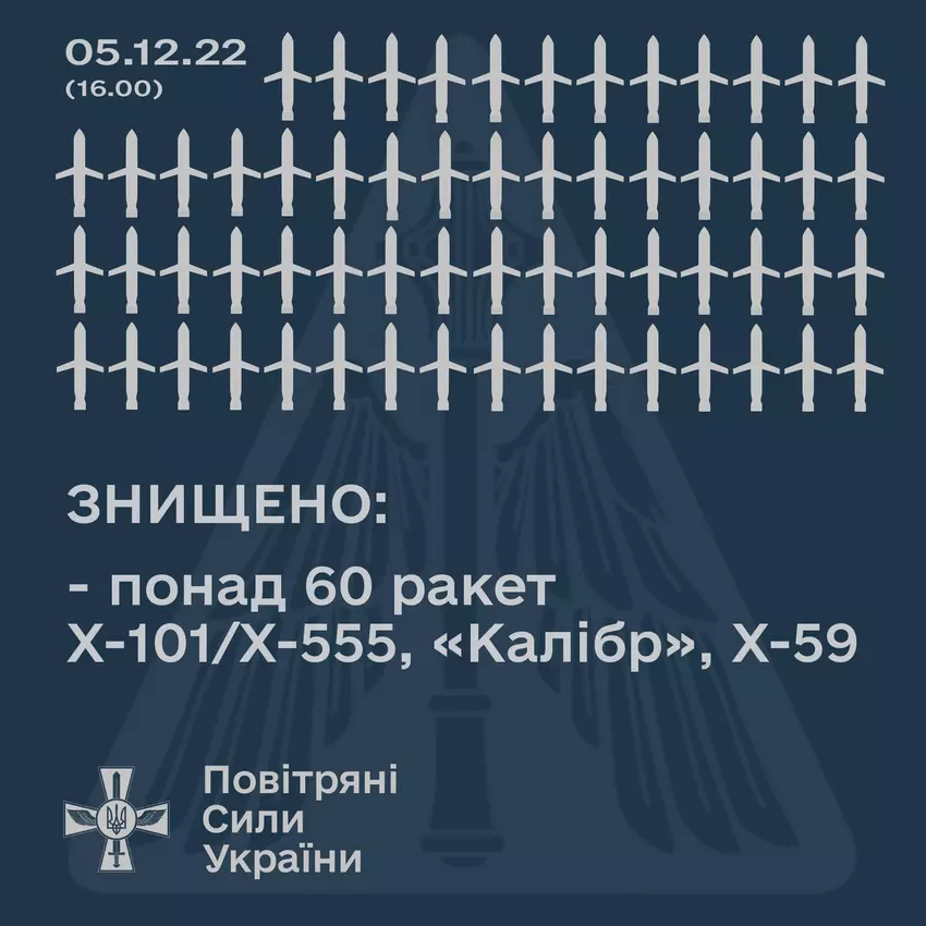 Dowództwo Sił Powietrznych Sił Zbrojnych Ukrainy informuje, że lotnictwo, mobilne zespoły ogniowe i jednostki rakiet przeciwlotniczych zdołały zestrzelić ponad 60 pocisków. Tym samym skuteczność obrony powietrznej 5 grudnia przekracza 85%.