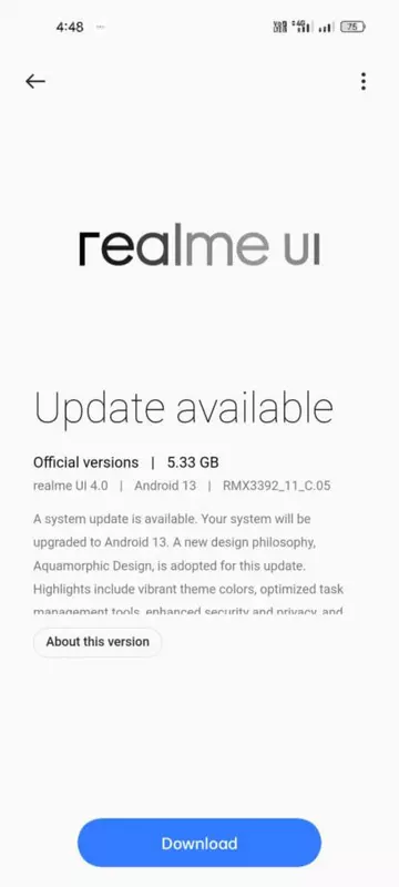 Aktualizacja została wydana z numerem builda RMX3392_11_C.05 i waży 5,33 GB. Aktualizacja OTA zaczęła być już odbierana przez niektórych użytkowników urządzenia. Wkrótce system będzie dostępny dla wszystkich.