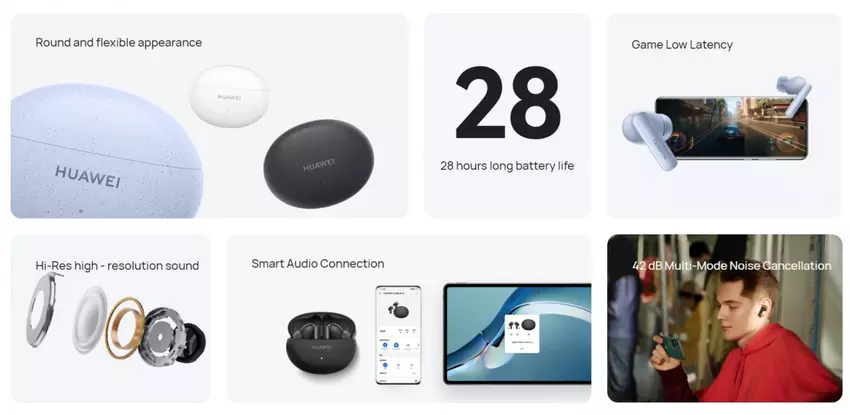 Jeśli chodzi o wydajność FreeBuds 5i, to mogą się one pochwalić ulepszonym systemem aktywnej redukcji szumów (w porównaniu z FreeBuds 4i). Wycisza obce hałasy aż o 42dB. Słuchawki wyposażone są również w Bluetooth 5.2 oraz 10-milimetrowe przetworniki. Urządzenie obsługuje kodek LDAC, a także posiada certyfikat Hi-Res Audio Wireless. Freebuds 5i można połączyć z wieloma gadżetami.