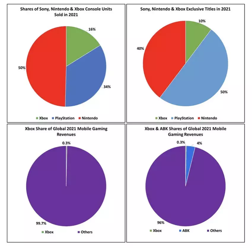 Po drodze Microsoft przedstawił FTC dowody na to, że nie jest liderem na rynku gier konsolowych, a w dziedzinie gier mobilnych pozycja korporacji nie ulegnie większej poprawie po przejęciu Activision Blizzard. Wszystko to widać na wykresach: