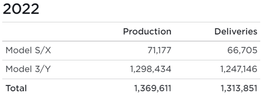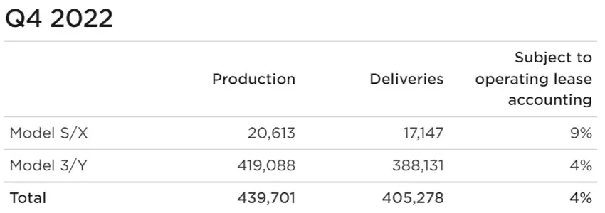 Tesla dostarczyła klientom 405 278 pojazdów w czwartym kwartale 2022 roku, w tym 17 147 Model S / X i 388 131 Model 3 / Y. Tymczasem firma wyprodukowała odpowiednio 20 613 i 419 088 pojazdów.