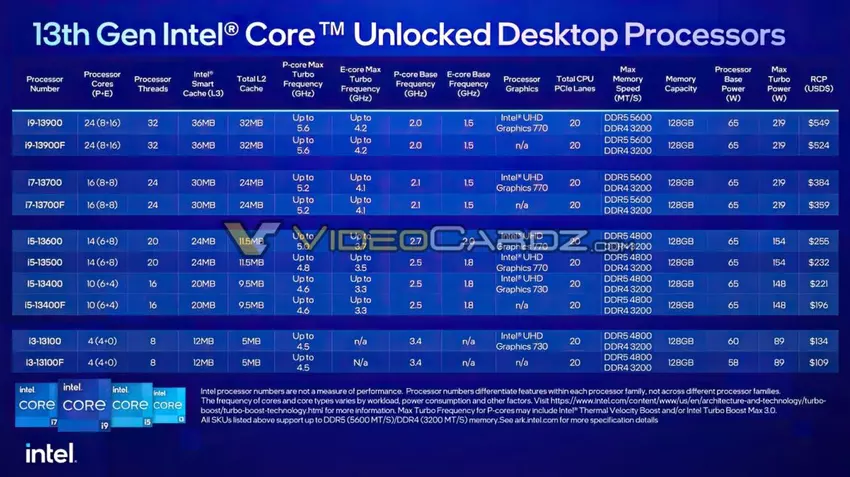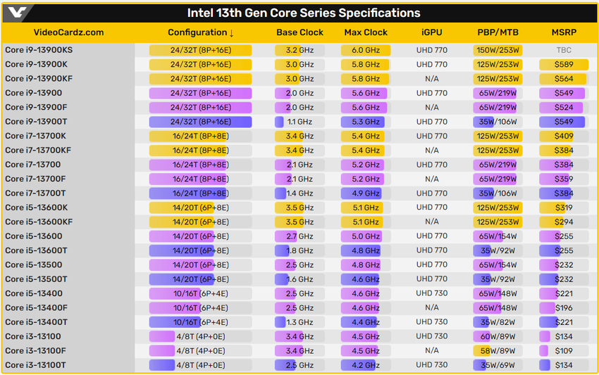 Najtańszą nowością jest Core i3-13100F. Posiada cztery rdzenie o wydajności 3,4-4,5GHz i kosztuje 109 dolarów. Ten sam model, ale z grafiką UHD 730 został wyceniony na 134 dolary. Najdroższym procesorem jest Core i9-13900. Dostał on 24 rdzenie (8P + 16E), 32 wątki oraz 2,0-5,6GHz i kosztował 549$,