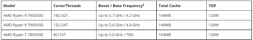 Zacznijmy od droższego modelu Ryzen 7000X3D. Serię reprezentują trzy układy o TDP wynoszącym 120W. Ryzen 9 7950X3D posiada 16 rdzeni, 32 wątki, 144MB pamięci 3D V-Cache i prędkości od 4,2 do 5,7GHz.