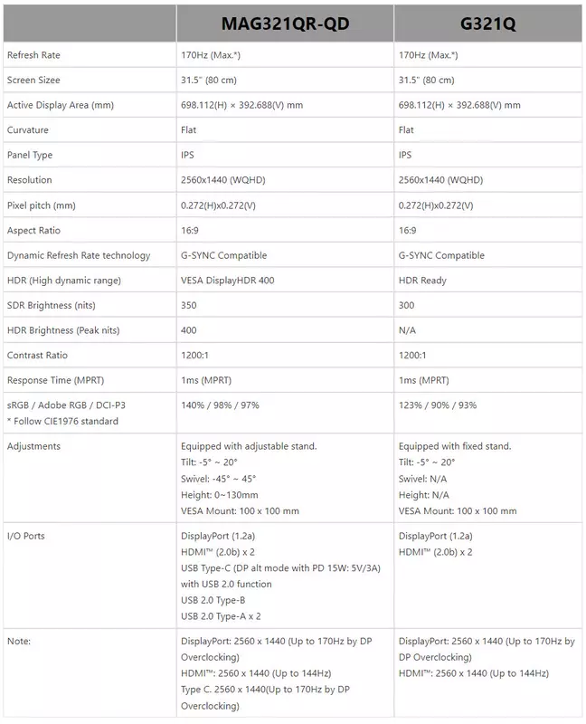MAG321QR-QD chwycił za 31,5-calowy ekran o rozdzielczości 2560 x 1440 pikseli, czyli modne w świecie określenie WQHD zamiast QHD. Pokrycie palety barw wynosi 140% sRGB, 98% Adobe RGB i 97% DCI-P3. Producent twierdzi, że wsparcie dla częstotliwości odświeżania wynosi do 170 Hz.