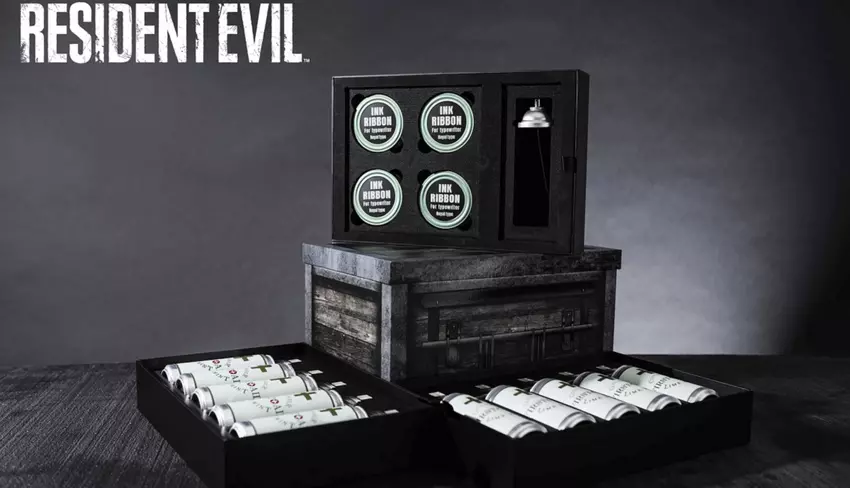Dziesięć 330 ml puszek napoju o smaku ogórka i mięty, stylizowanych na spraye lecznicze z gier Resident Evil, zapakowano w pudełko przypominające skrzynię do przechowywania przedmiotów z popularnej serii horrorów.