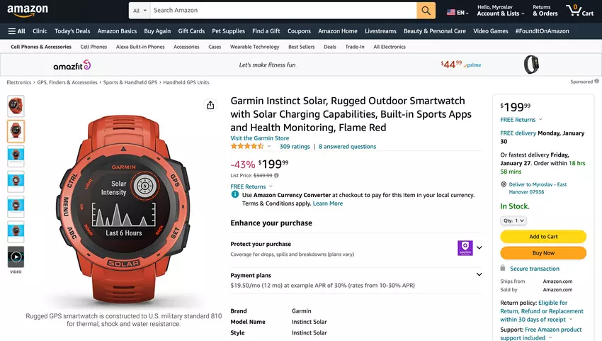 Garmin Instinct Solar z GPS, do 54 dni życia baterii i panel słoneczny na sprzedaż na Amazon za 149 dolarów off