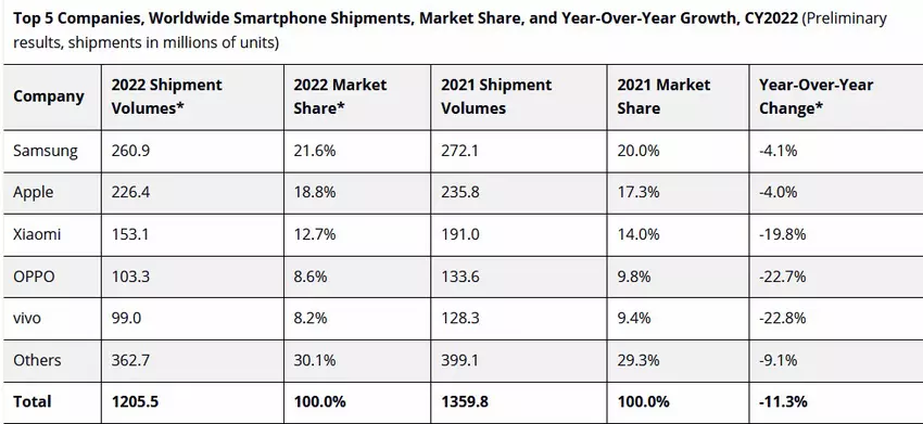 Patrząc całościowo na rok 2022, globalne wysyłki smartfonów spadły o 11,3% do 1,21 mld.