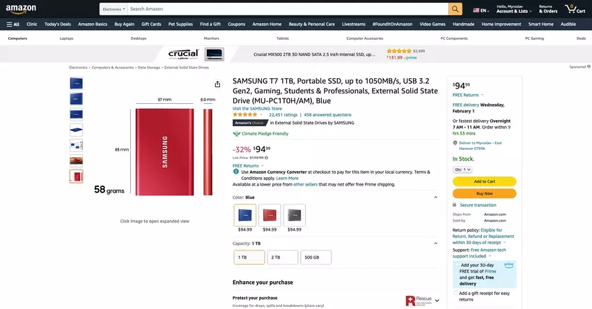Samsung T7 1TB USB 3.2 Gen2 SSD sprzedaje się za mniej niż 100 dolarów na Amazonie
