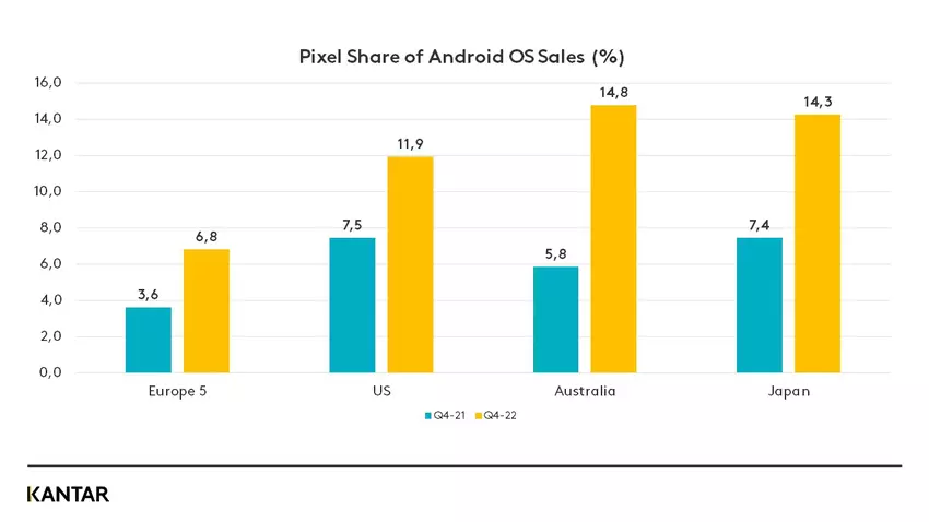 Udział Google w rynku smartfonów z systemem Android w Europie wzrósł z 3,6 proc. do 6,8 proc. w IV kwartale 2022 r. w porównaniu z IV kwartałem 2021 r., podała agencja analityczna Kantar. W USA udział Pixela wyniósł w okresie sprawozdawczym 11,9% w porównaniu do 7,5% w okresie bazowym.