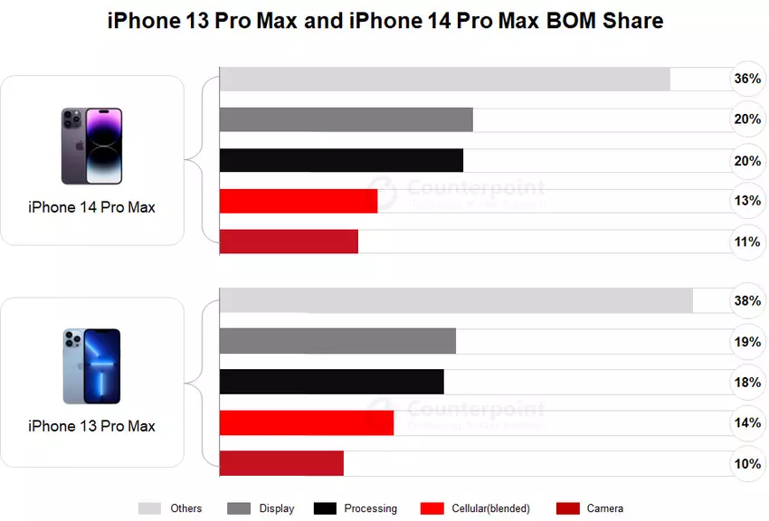 Głównym powodem podwyżki cen był procesor mobilny Apple A16 Bionic. Jego cena skoczyła o 11 dolarów. Chip jest jednym z komponentów opracowanych przez samo Apple. Ich udział w kosztach towarów wynosi 22%. Tylko o 1% poszła w górę cena aparatu, który posiada 48MP sensor Sony i optykę Sunny Optical.